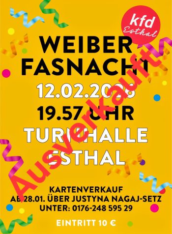 29.1.2026Die kfd Esthal teilt mit, dass die für den 12. Februar 2026 geplante Weiberfasnacht in der Turnhalle Esthal restlos ausverkauft ist. Ein weiterer Kartenverkauf ist nicht mehr möglich. Die Veranstalterinnen […]