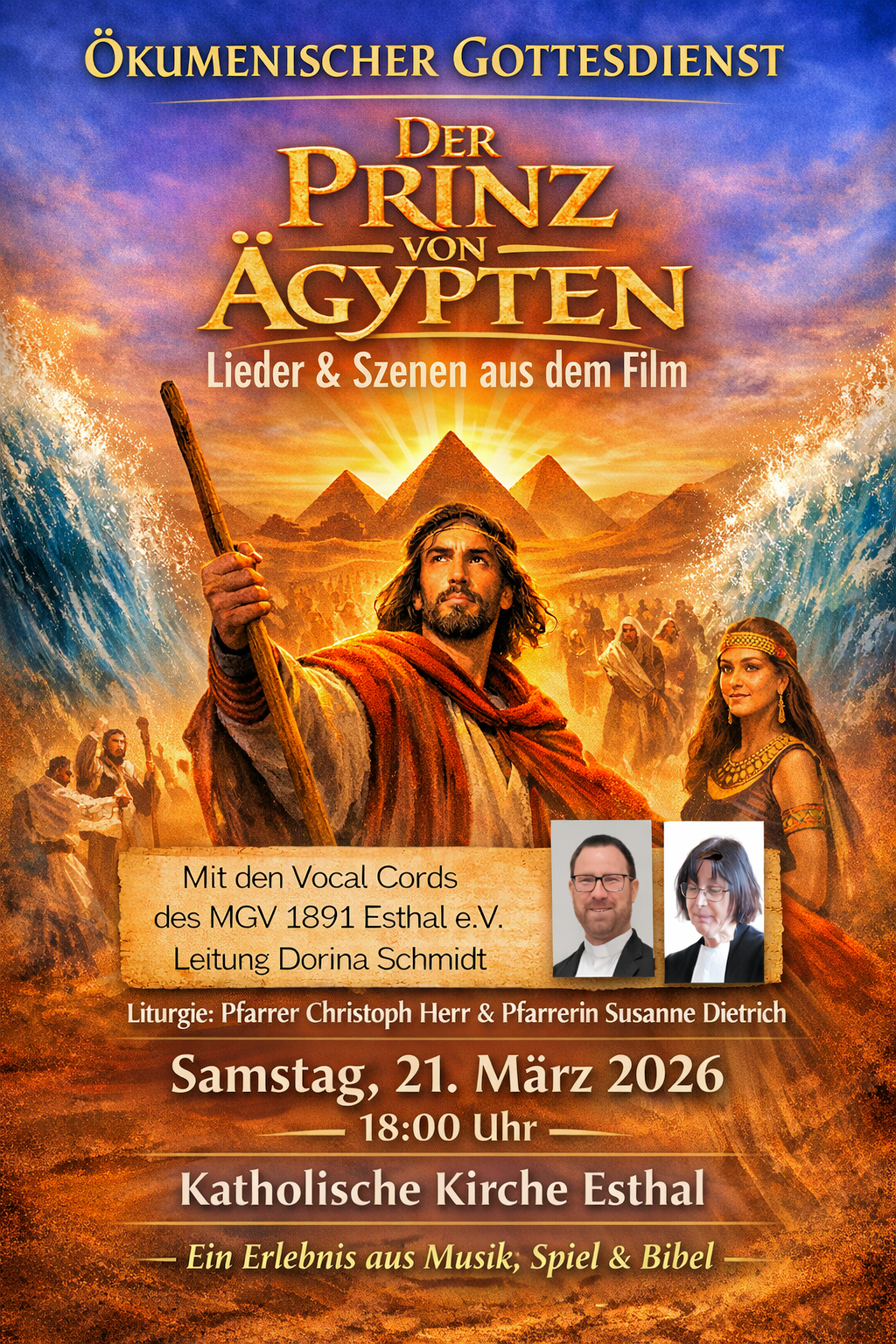 Gestaltet wird der Gottesdienst von den Vocal Cords des MGV 1891 Esthal e.V. unter der Leitung von Dorina Schmidt. Die Sängerinnen und Sänger bringen die eindrucksvolle Geschichte nicht nur musikalisch, sondern auch szenisch auf die Bühne: In kleinen Spielszenen stellen sie den Auszug des Volkes Israel aus Ägypten dar.