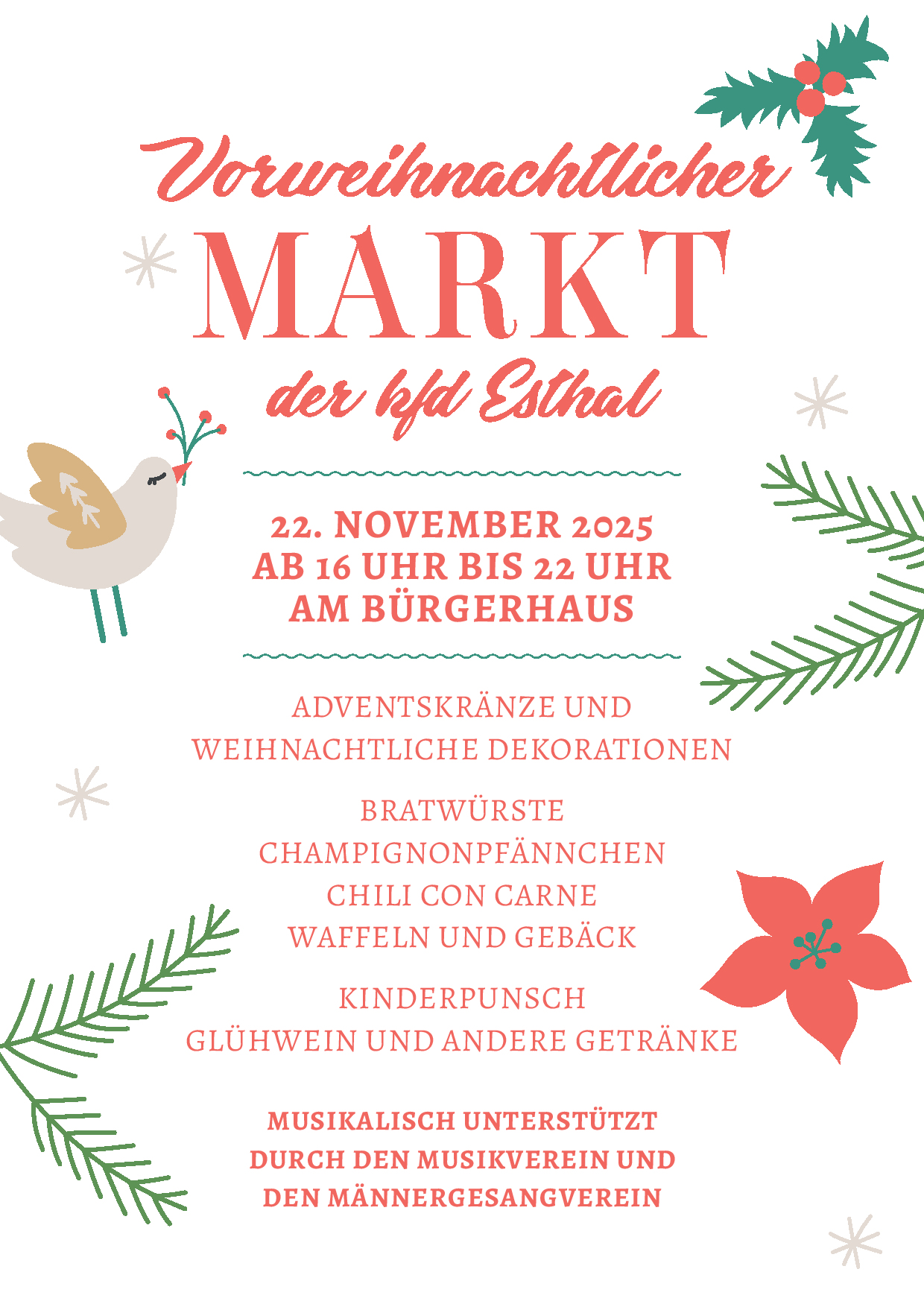 Die Katholische Frauengemeinschaft Esthal (kfd) lädt am Samstag, den 22.11.2025, herzlich zum traditionellen vorweihnachtlichen Markt rund um das Bürgerhaus ein.