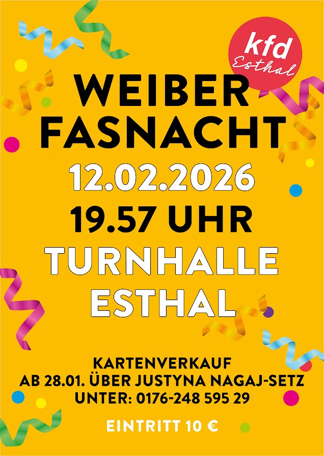 Turnhalle Esthal Hauptstraße 63, 67472 Esthal, DeutschlandVeranstaltungen 2026Die katholische Frauengemeinschaft kfd Esthal lädt am Mittwoch, 12. Februar 2026, zur traditionellen Weiberfasnacht in die Turnhalle Esthal ein. Beginn
